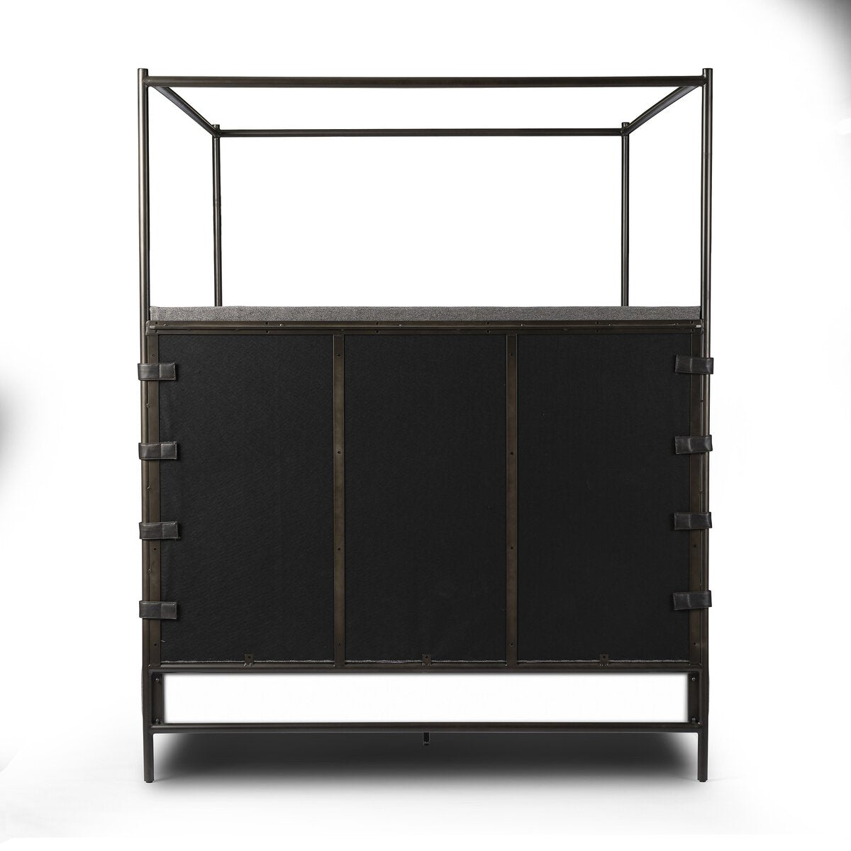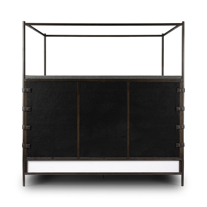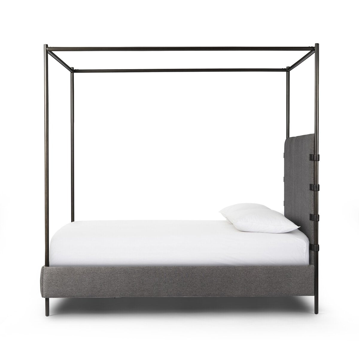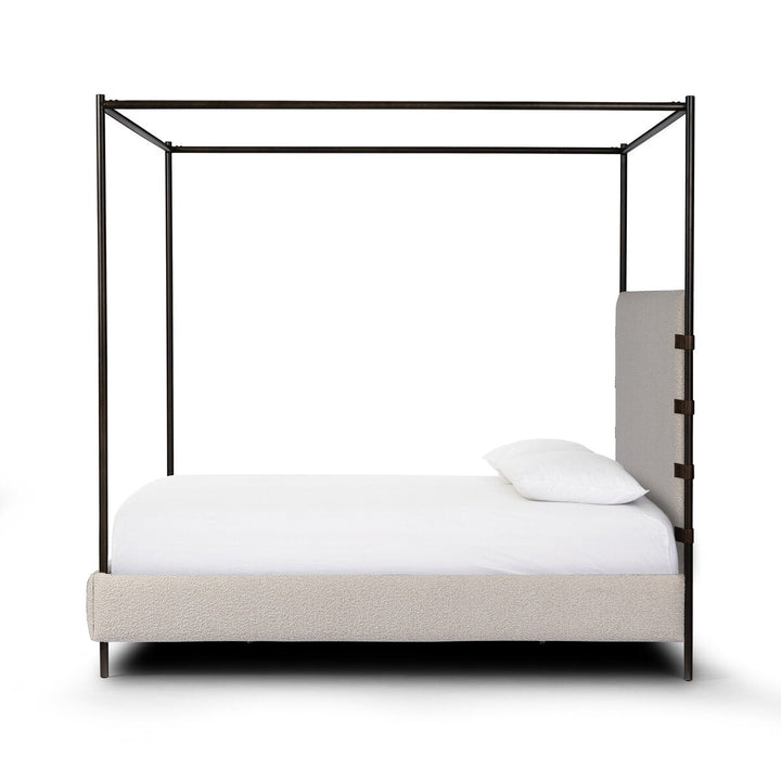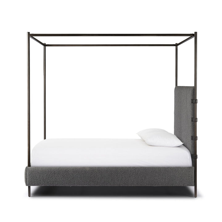 Bring texture into play. This iron canopy bed features a headboard upholstered in a classic boucle fabric with decorative leather straps for a material-driven contrast. Standard box spring required. This bed is not compatible with an adjustable mattress.