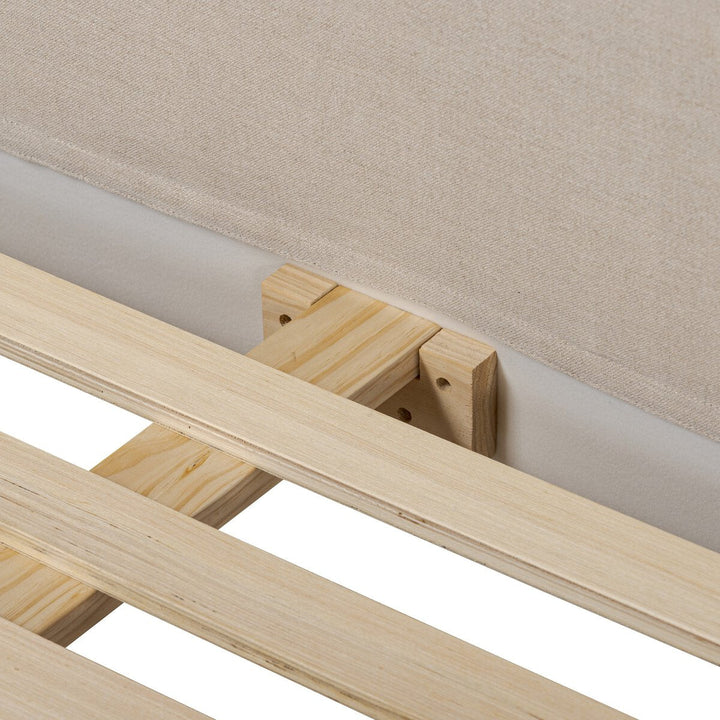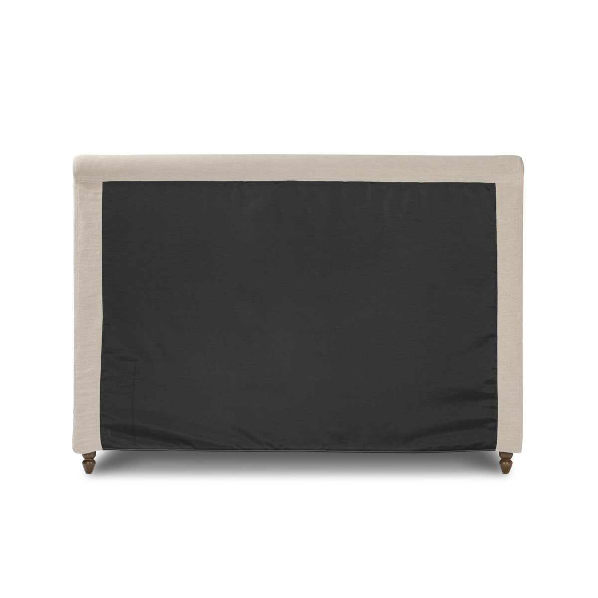 This heritage-style bed reimagines the classic sleigh silhouette. Cream-colored, linen-like fabric slipcover is both removable and washable for practicality. Turned feet in brown parawood peek from under the slip, grounding the bed's stately charm.