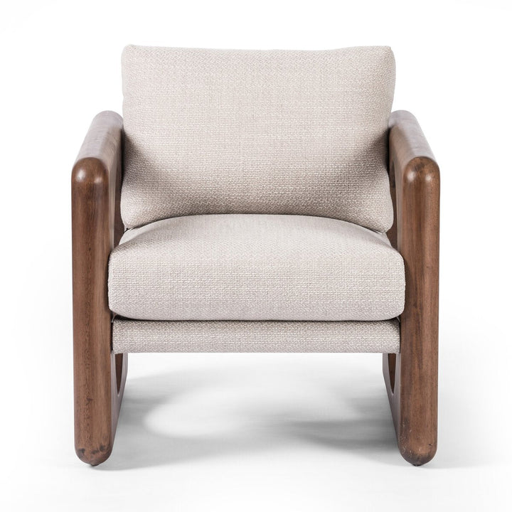 Contrasting shapes come together to form a modern yet vintage-inspired armchair. Solid parawood frame features large circular cutouts and is smoothed and rounded on all sides for extra movement. Sling chair construction is topped with loose feather-blend cushions covered in a heavily textured performance fabric. Performance fabrics are specially created to withstand spills, stains, high traffic and wear, ensuring long-term comfort and unmatched durability.