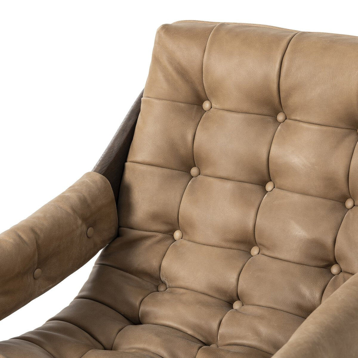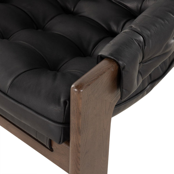 A Seventies-era style inspired by a flea market find, a dramatically tufted sling seat of black top-grain leather angles at the just-right pitch for total comfort, with wide, brown ash framing. Sourced from one of the oldest family-owned tanneries in Italy's Bassano del Grappa, heirloom leather is salvaged and processed from upcycled hides featuring an abundance of natural markings, scars and color variations.