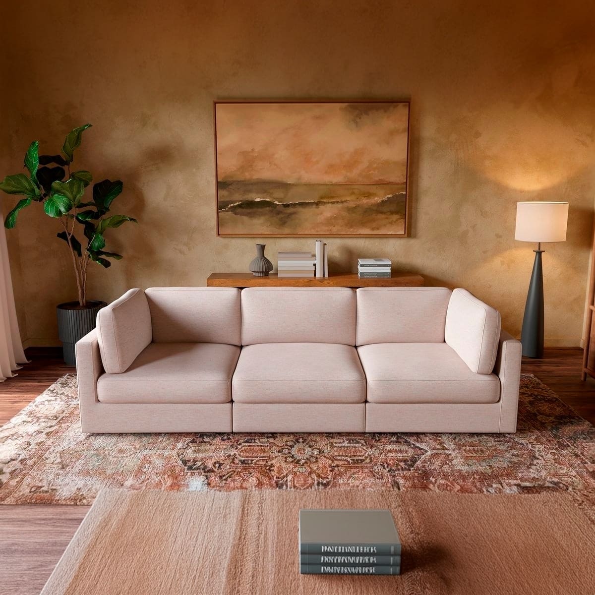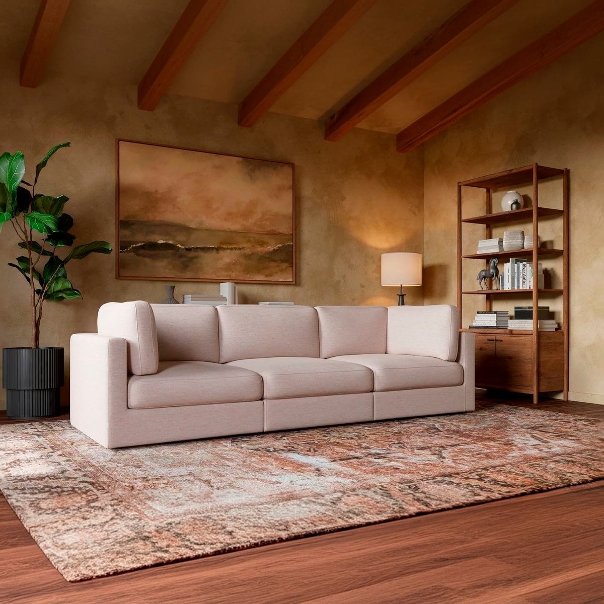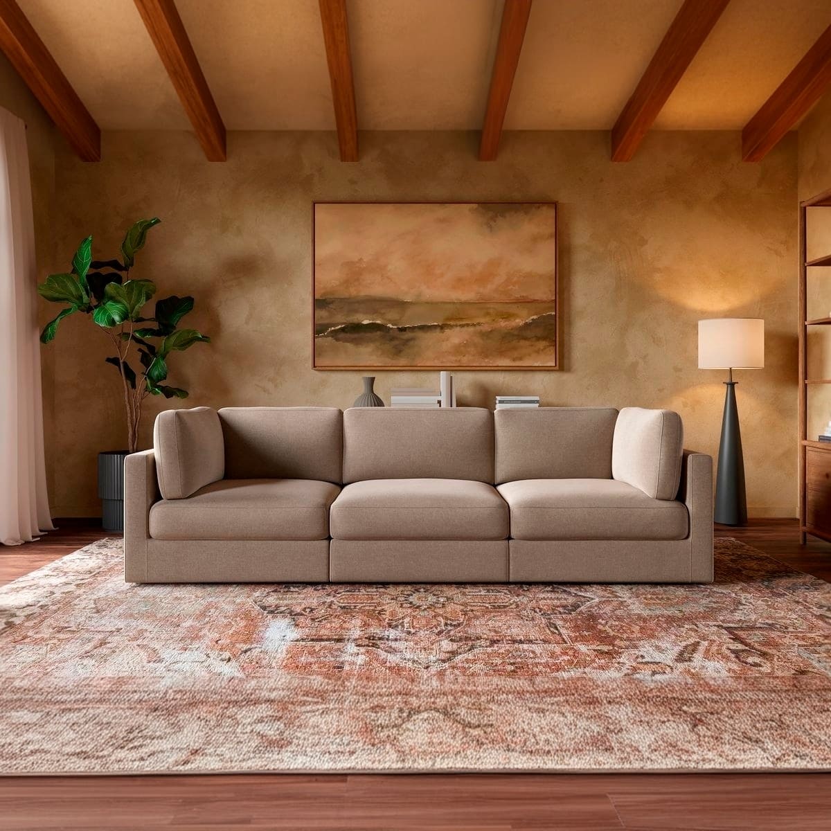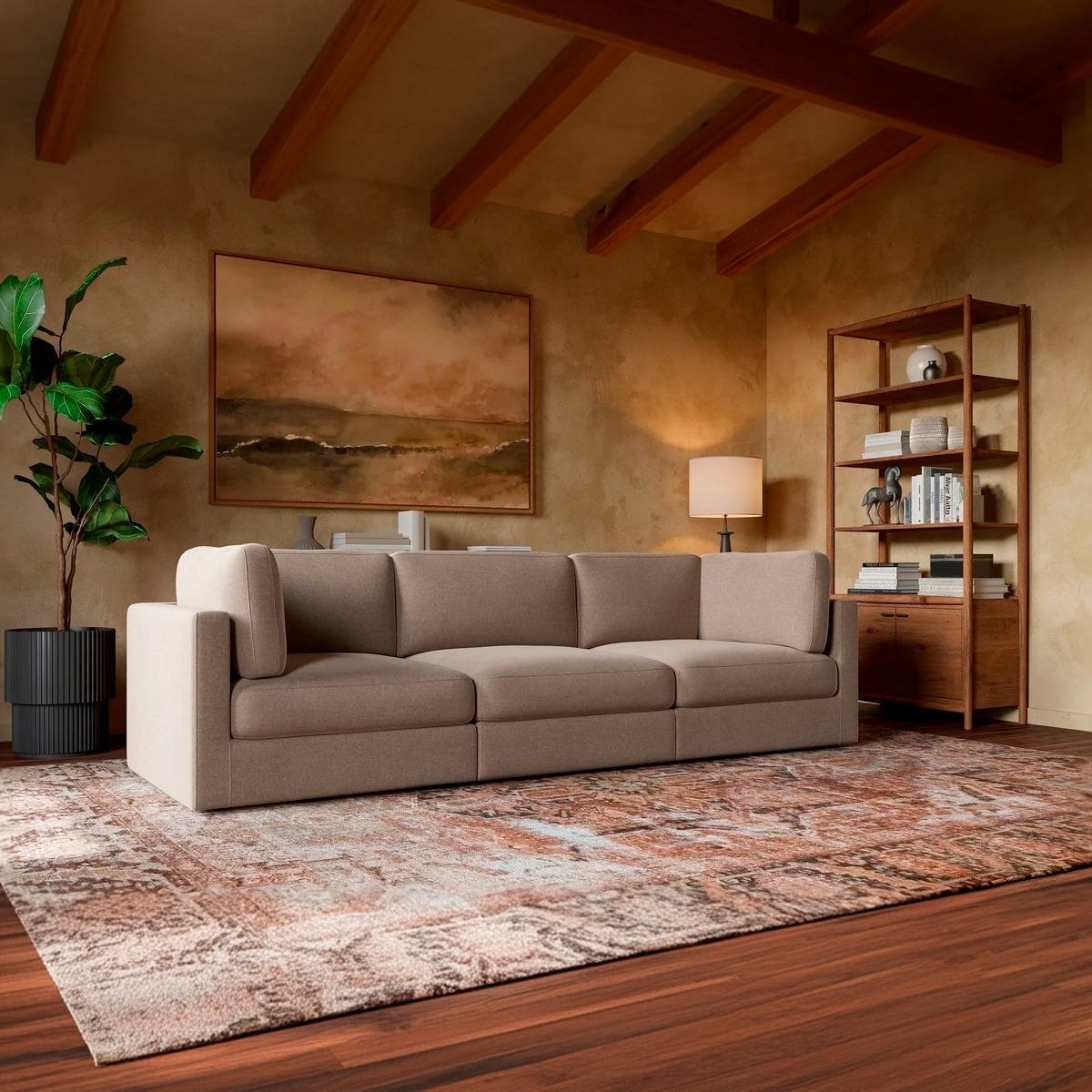 The modular design allows you to customize your seating configuration to fit any space, whether you’re outfitting a cozy apartment or an open-concept living room. Wide arms, deep seats, and plush, supportive cushions invite you to relax and unwind.