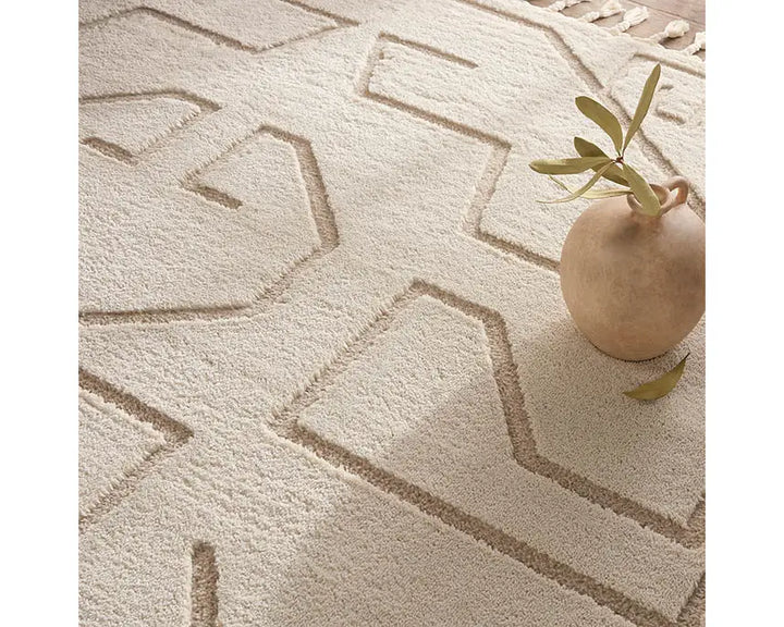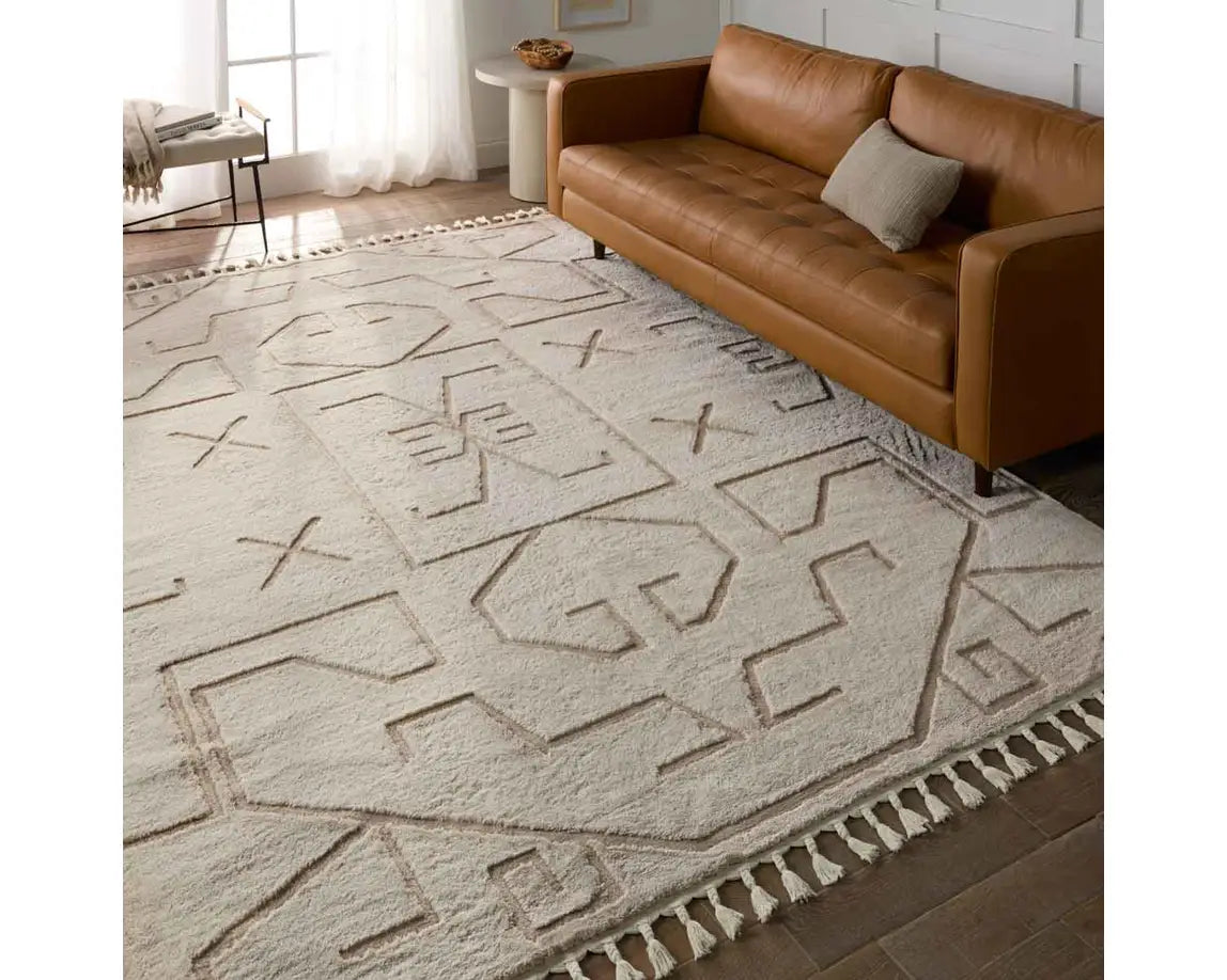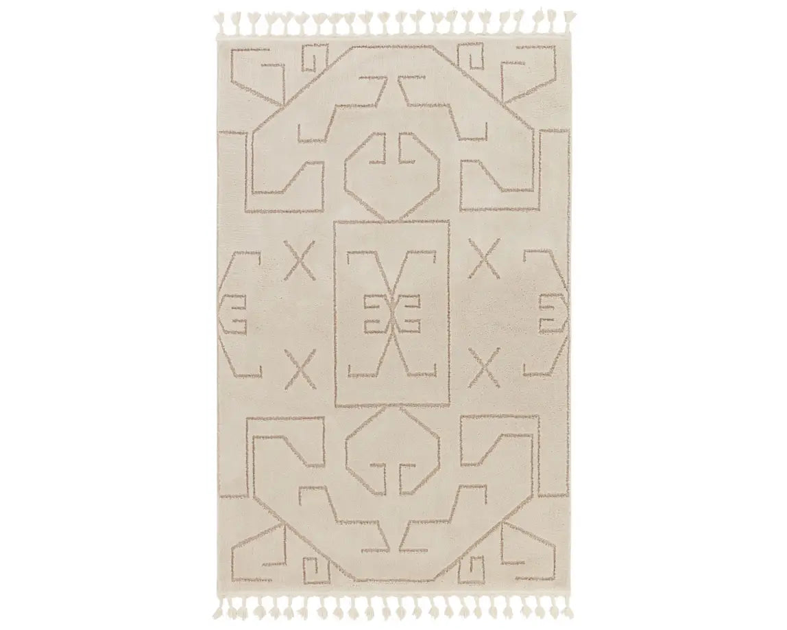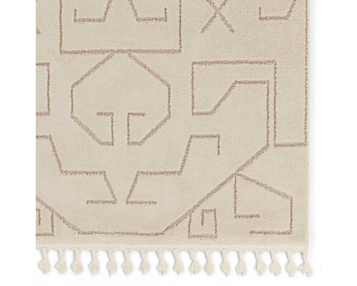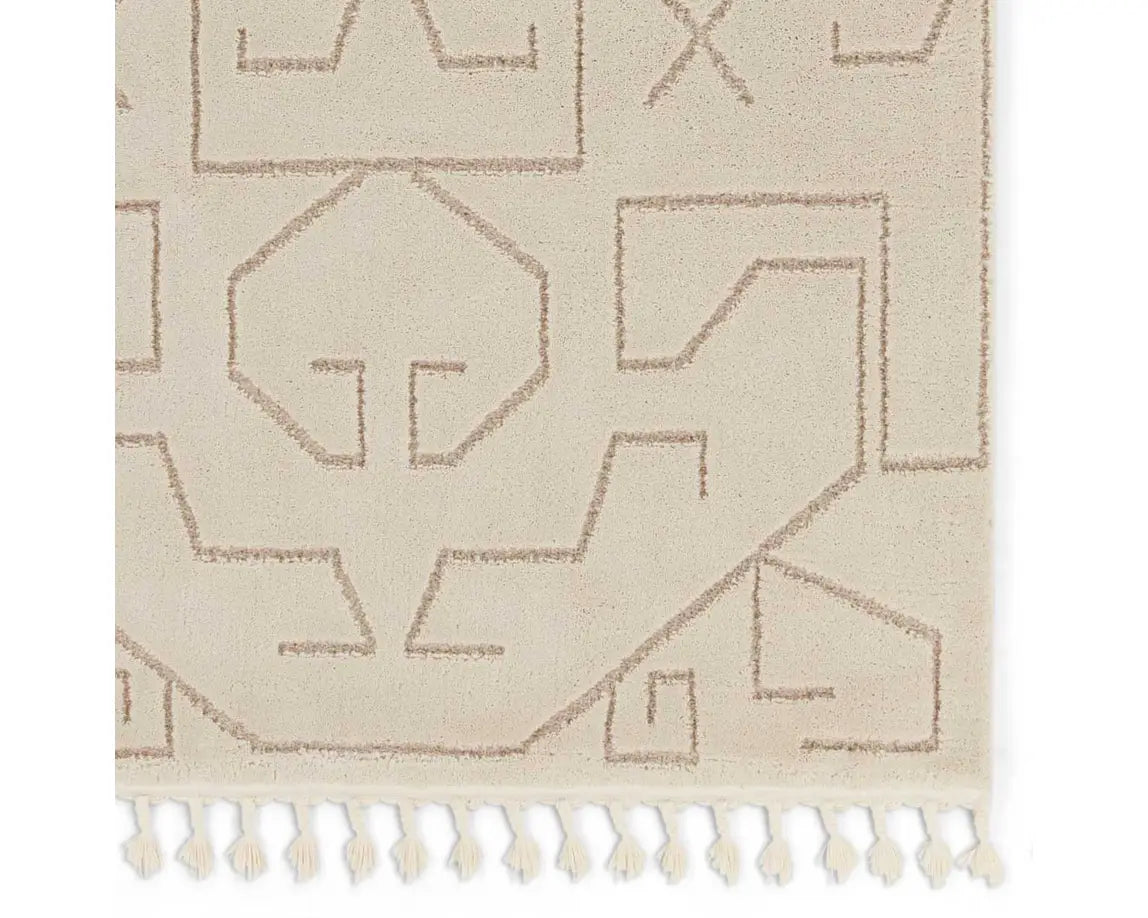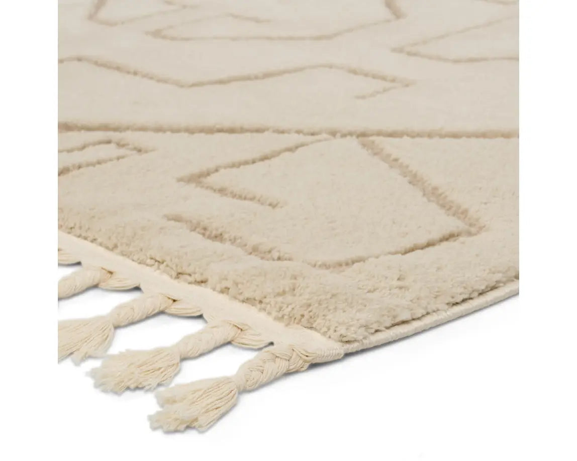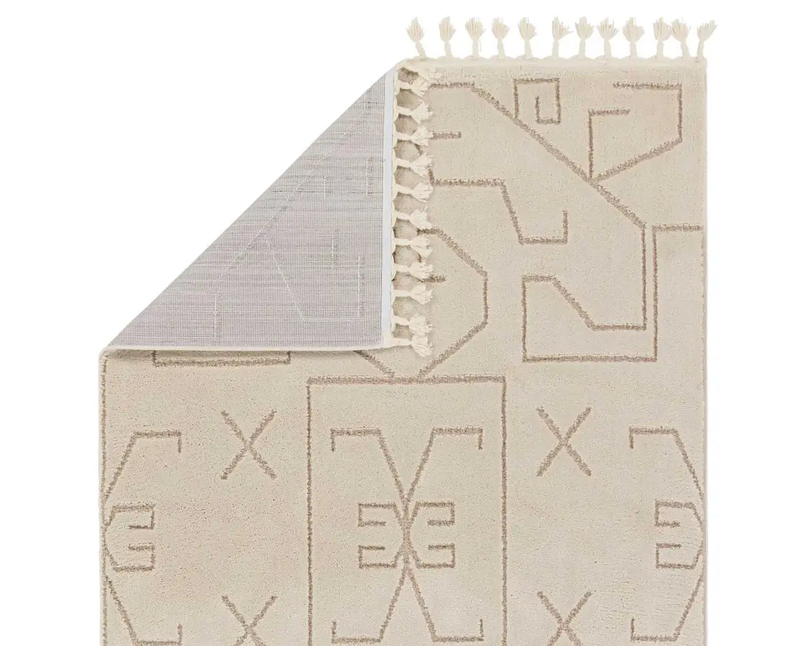 The Jaida collection is inspired by a coveted blend of modern Moroccan style and cozy, inviting vibes. These rugs showcase an incredibly soft hand, with a touch high-low detail mixed into the pattern, and a shed-free construction of polyester and polypropylene. The braided, cream fringe paired with a cream and beige, geometric pattern of the Nicia rug provides visual texture and global appeal. This plush area rug thrives in high traffic areas of the home such as living rooms, foyers, halls, and sunrooms.