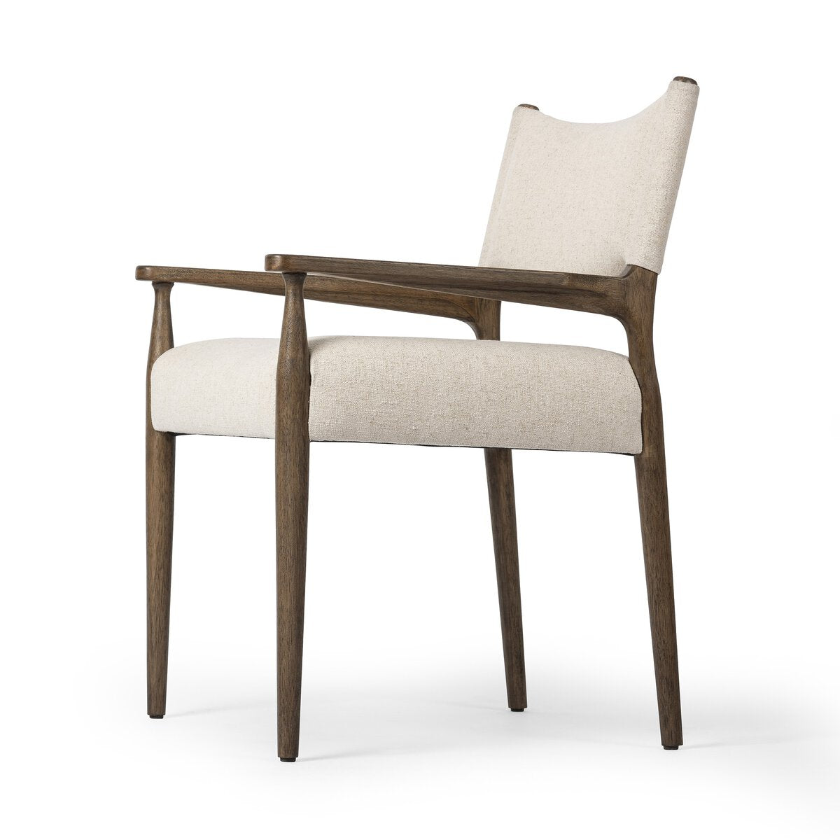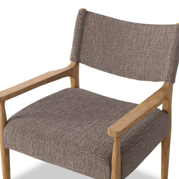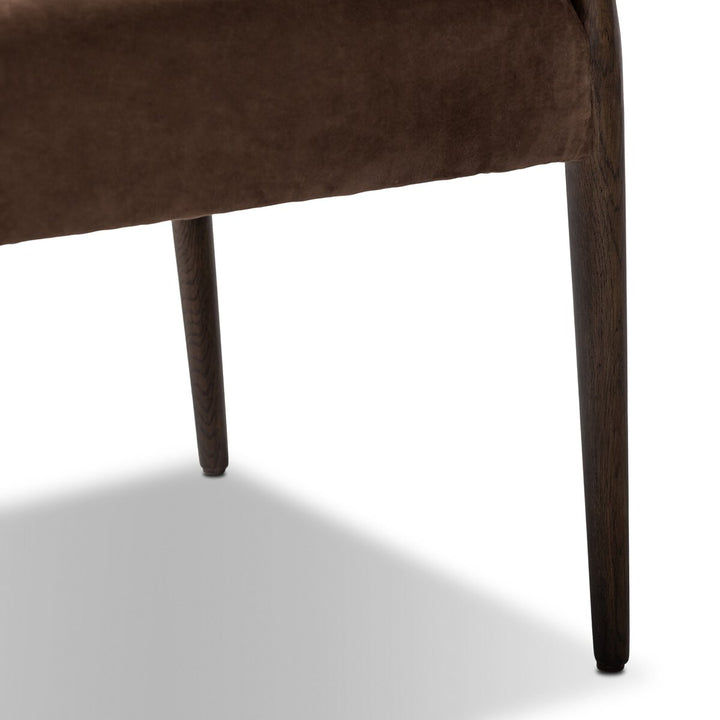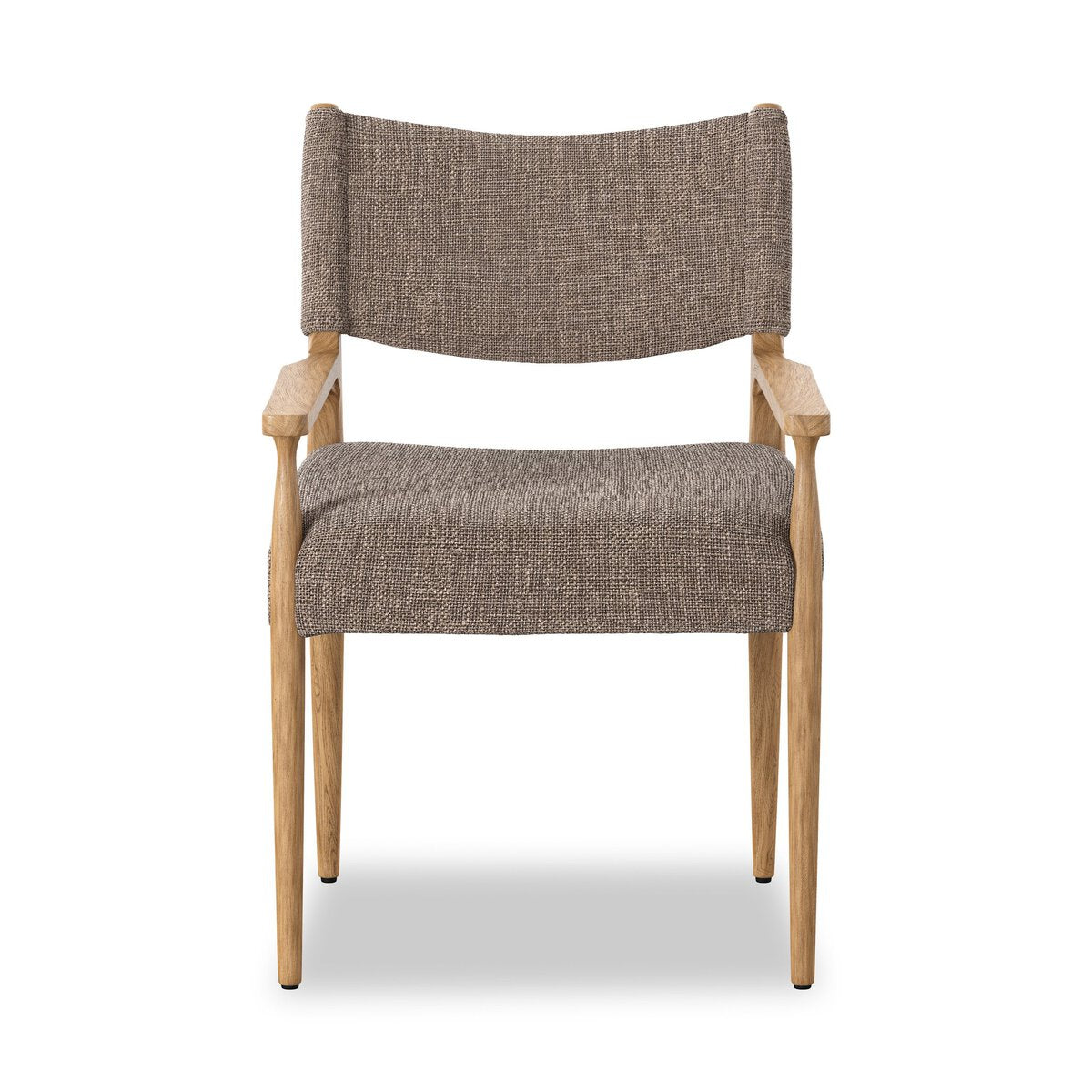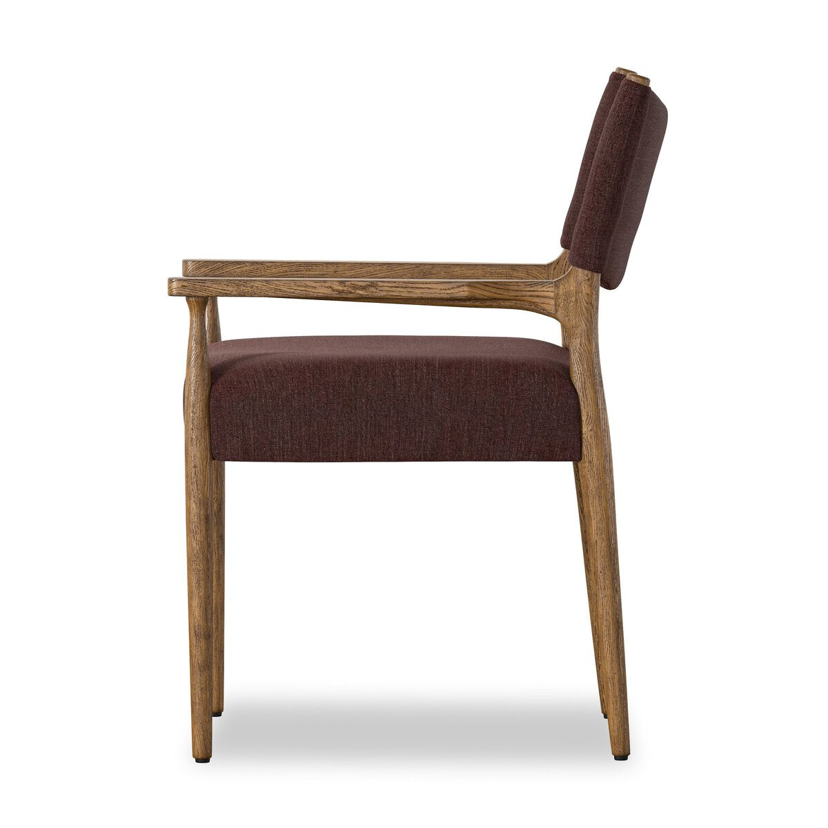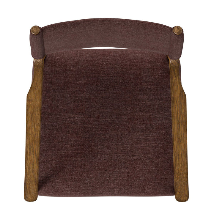 A midcentury-inspired piece brought to modern speed. A supportive, sling-style back and seat cushion are upholstered in a soft, velvety fabric, with toasted oak arms prime for the head of the table.