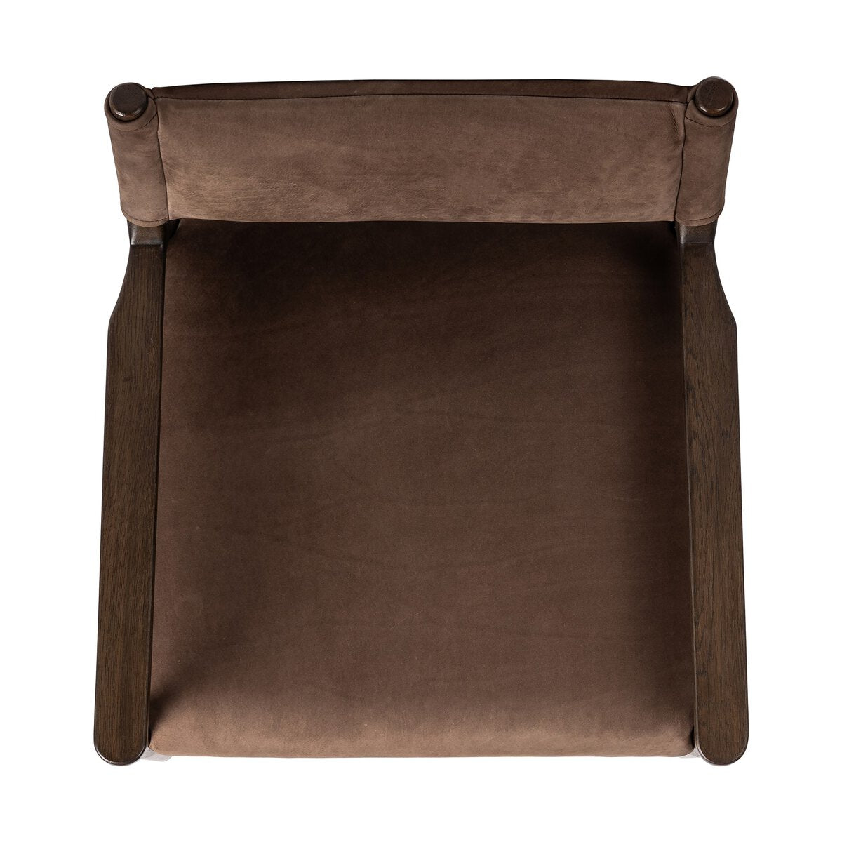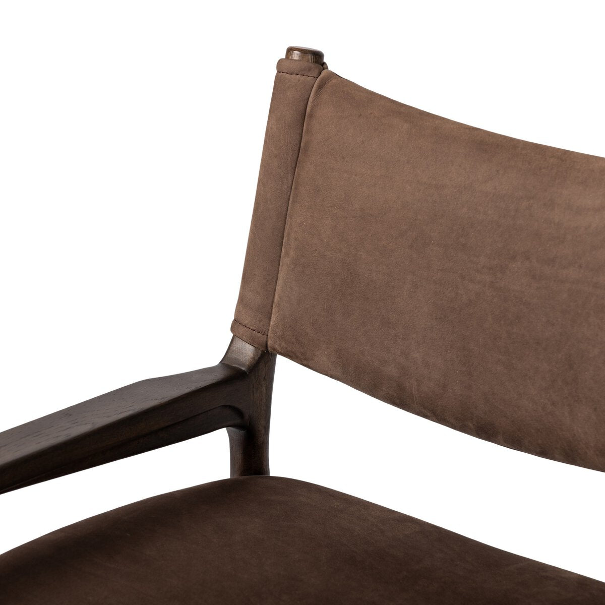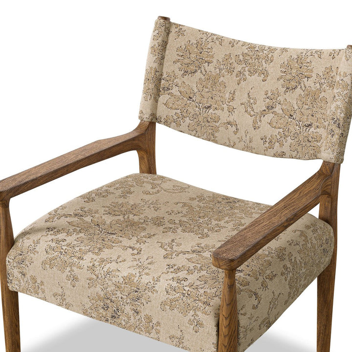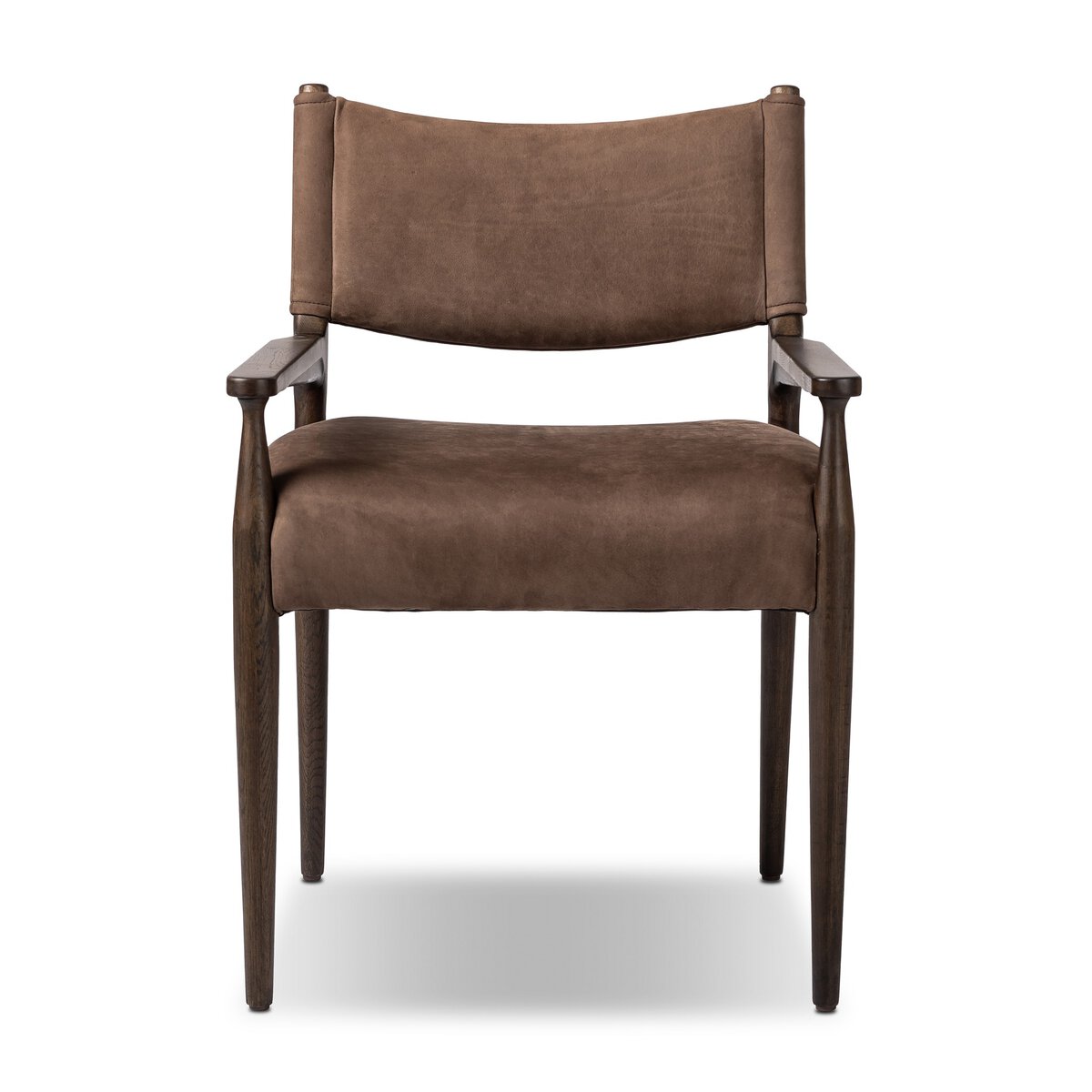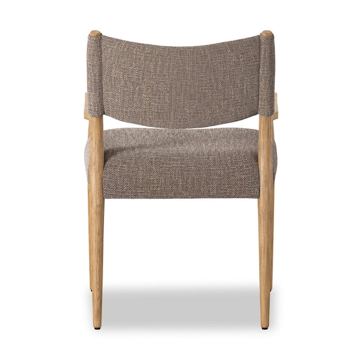 A midcentury-inspired piece brought to modern speed. A supportive, sling-style back and seat cushion are upholstered in a soft, velvety fabric, with toasted oak arms prime for the head of the table.