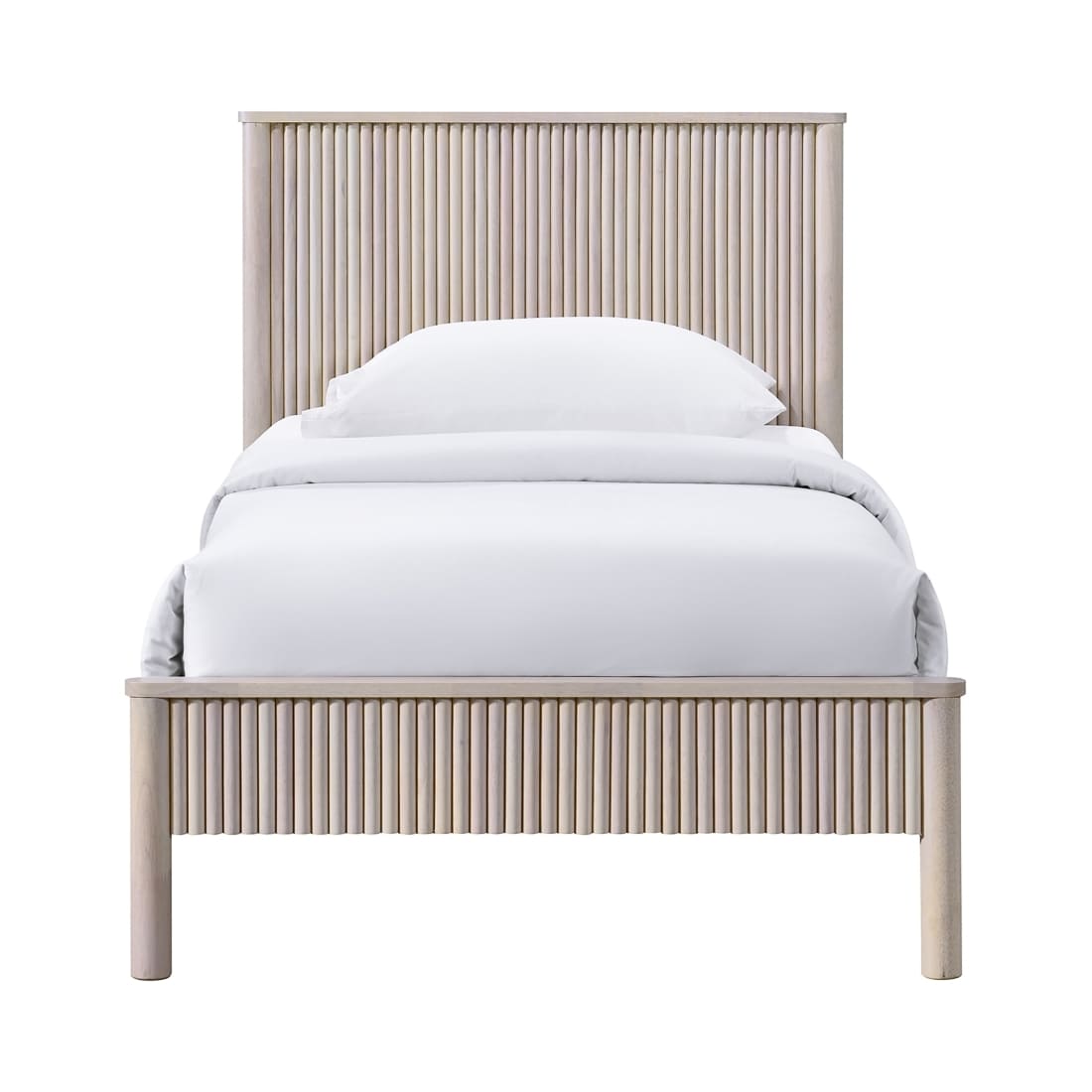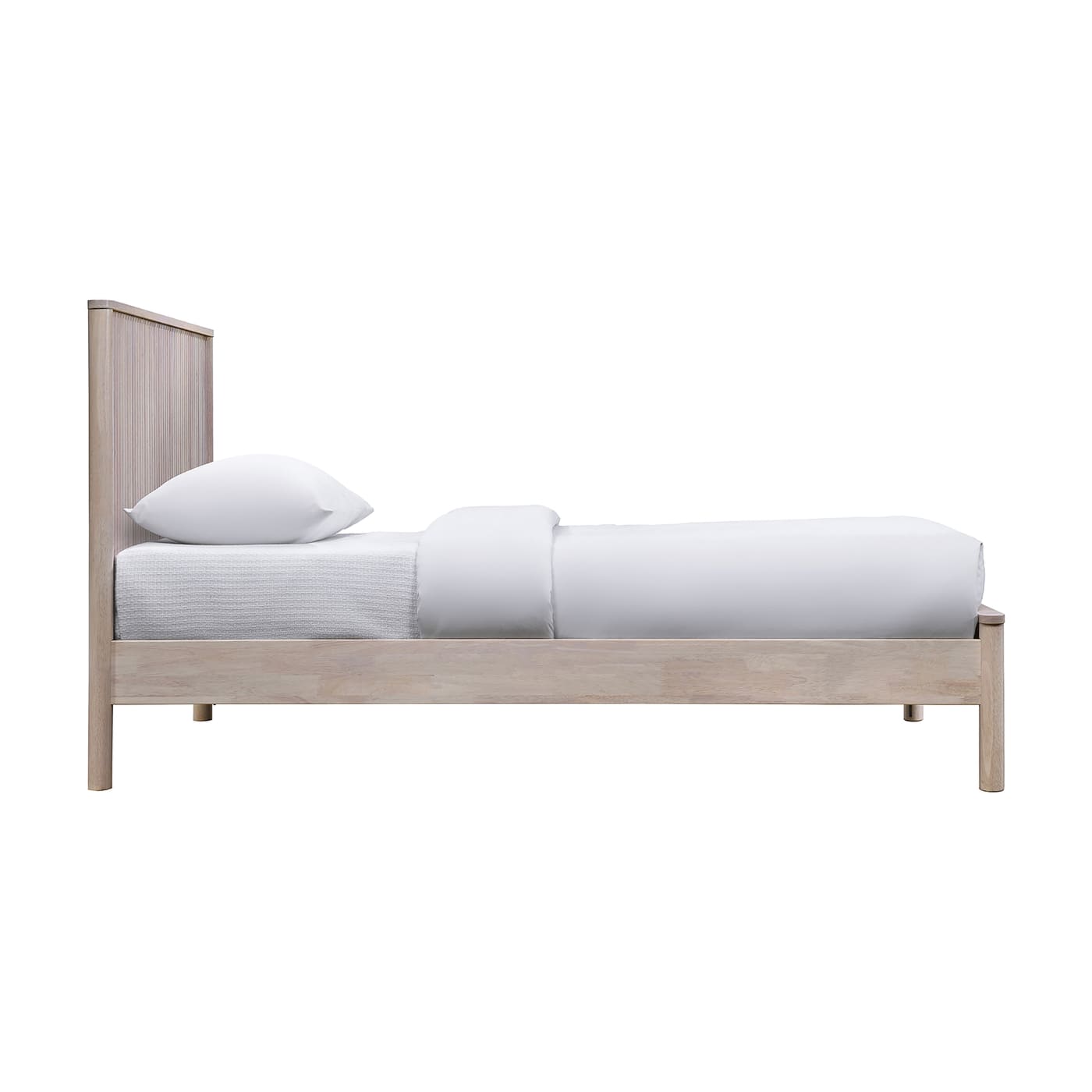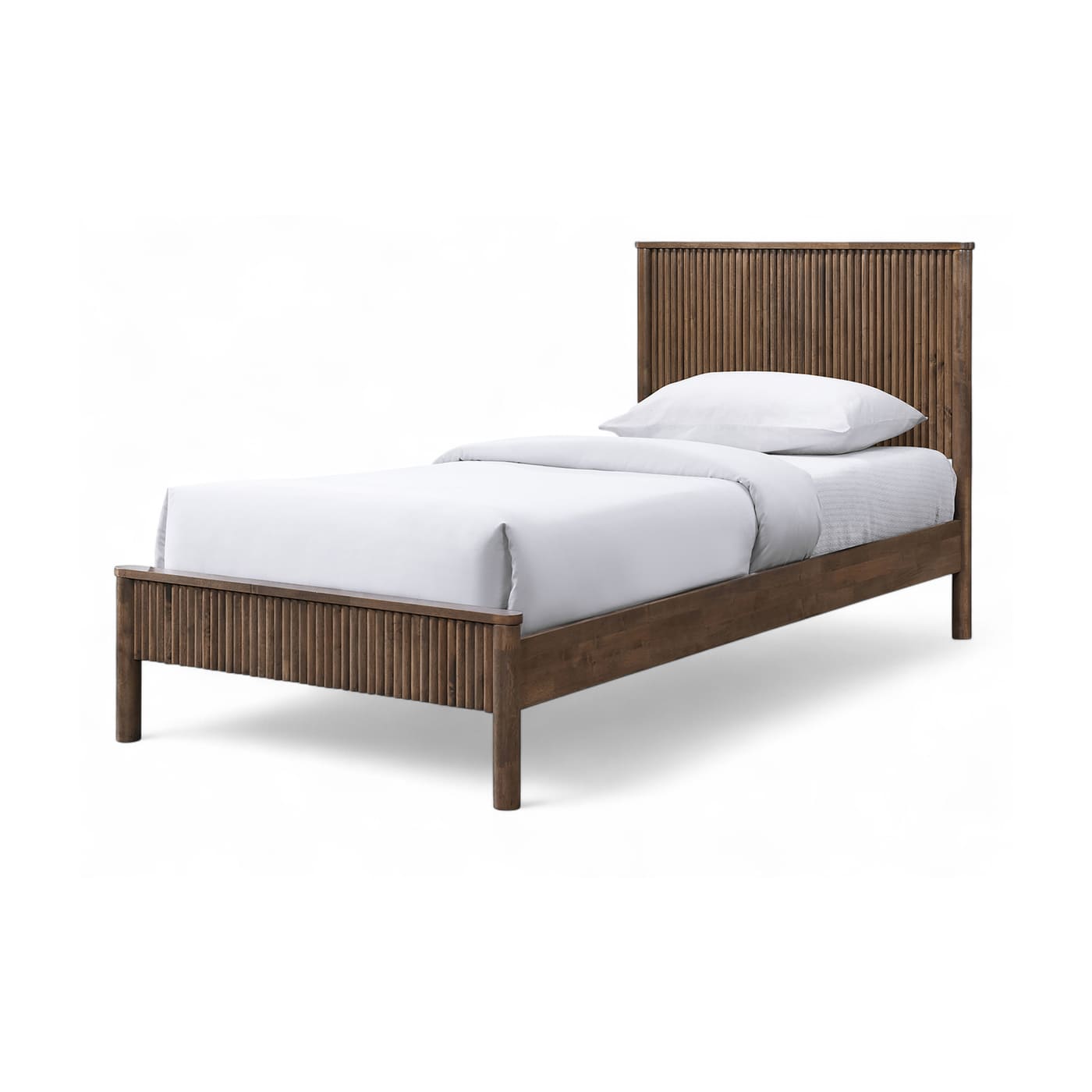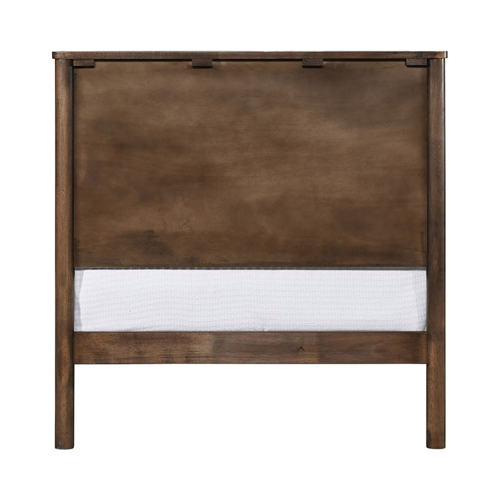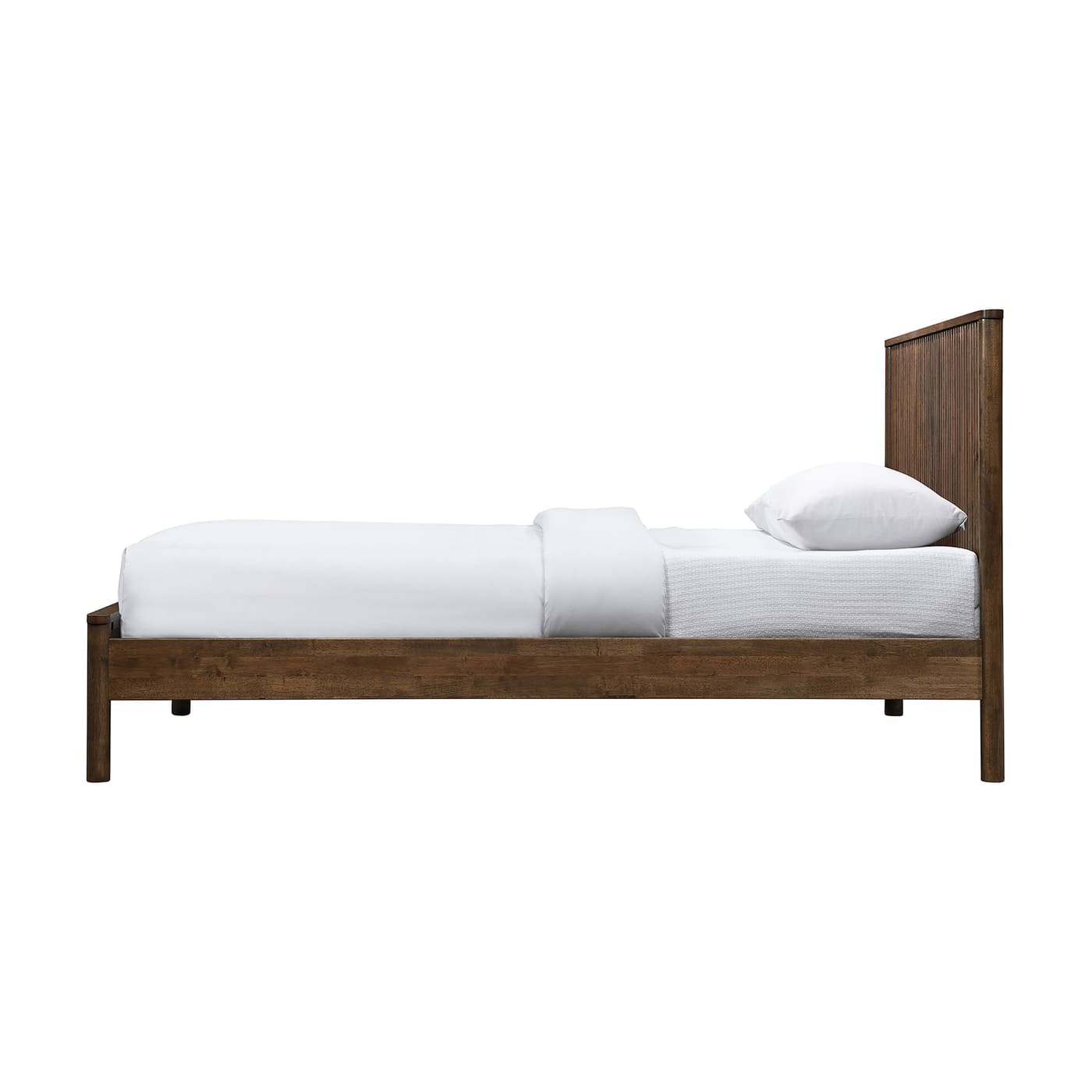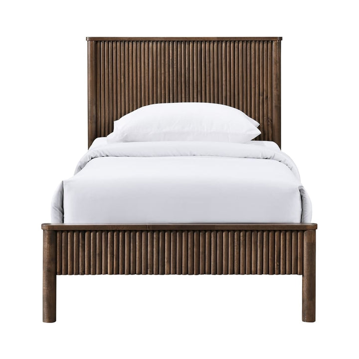 The sturdy Kivo solid wood king bed in a rich oak finish brings timeless warmth to your bedroom. Vertical slatted detailing across the headboard and footboard adds a striking mid-century touch while keeping the look clean and modern. Built from solid wood, this piece blends durability with understated sophistication for a bed that anchors the room with style.