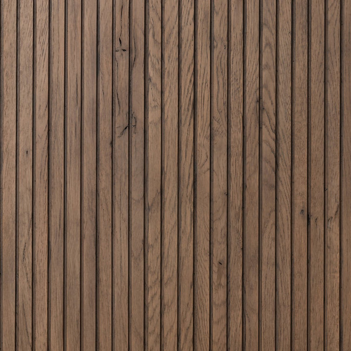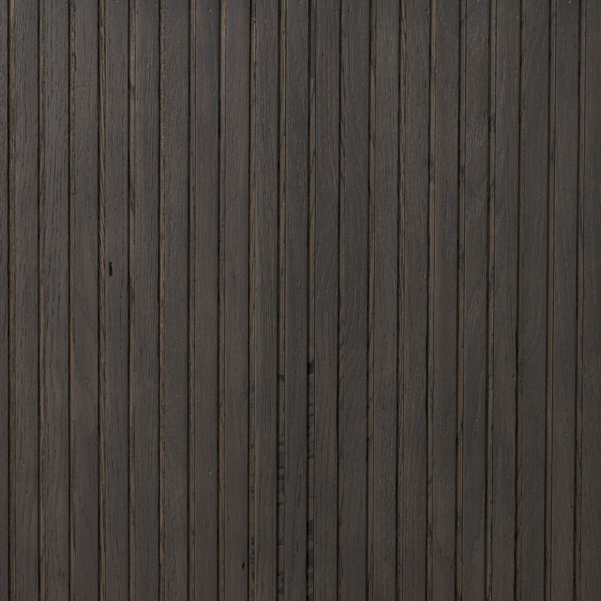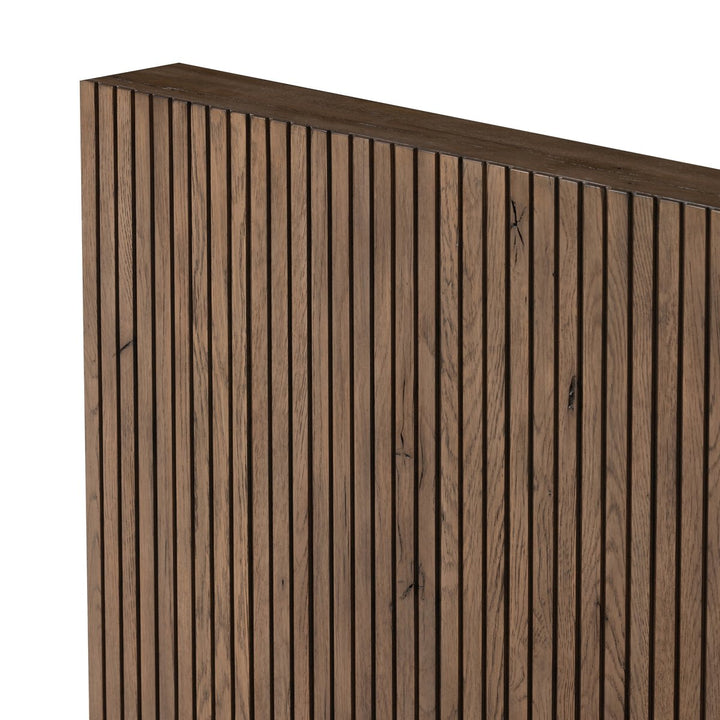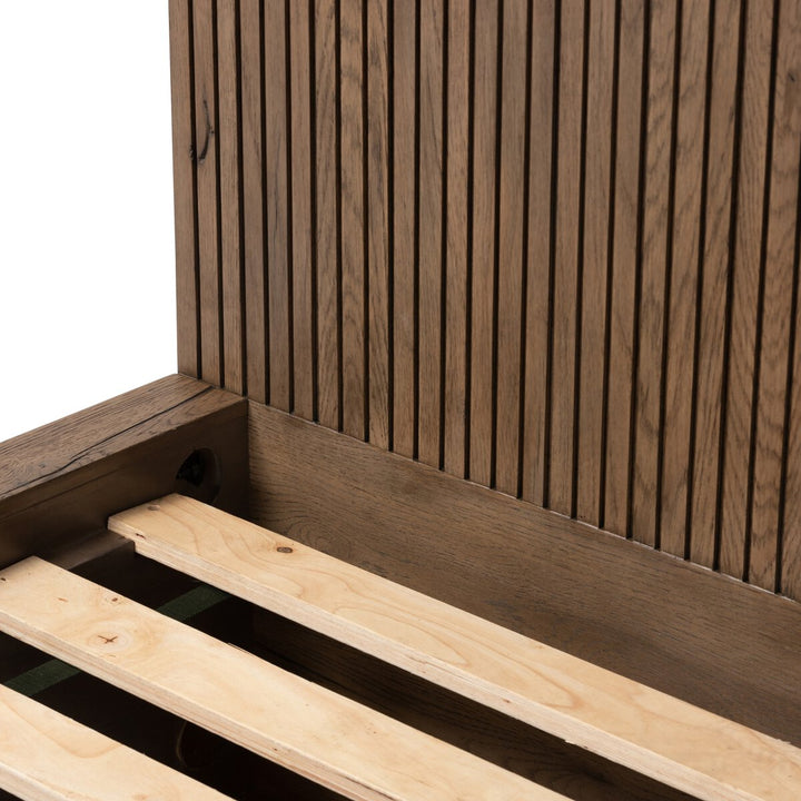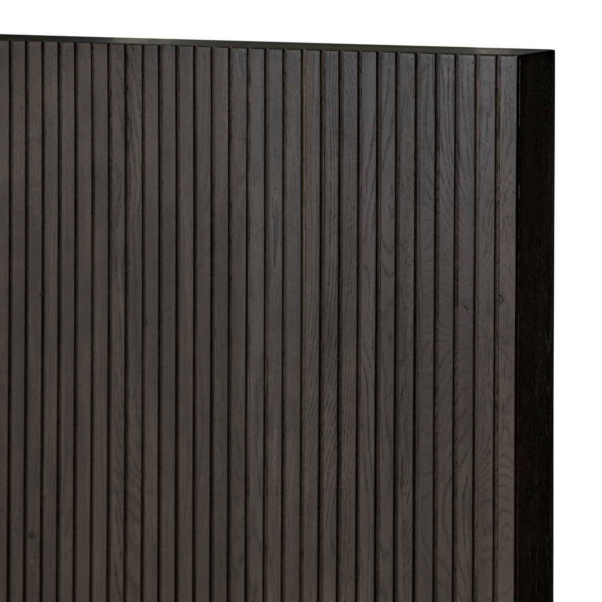 Designed by Thomas Bina and Ronald Sasson, a design partnership blending both modern minimalist and Brazilian influences. Crafted from a mix of solid oak and thick-cut oak veneer, this clean-lined bed features vertical reed detailing on the tall headboard and beautiful horizontal graining on the footboard for extra drama.