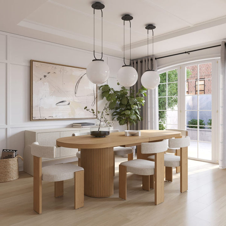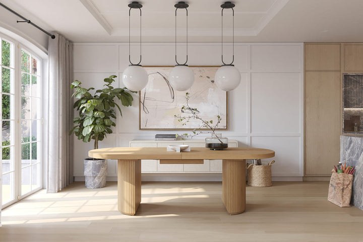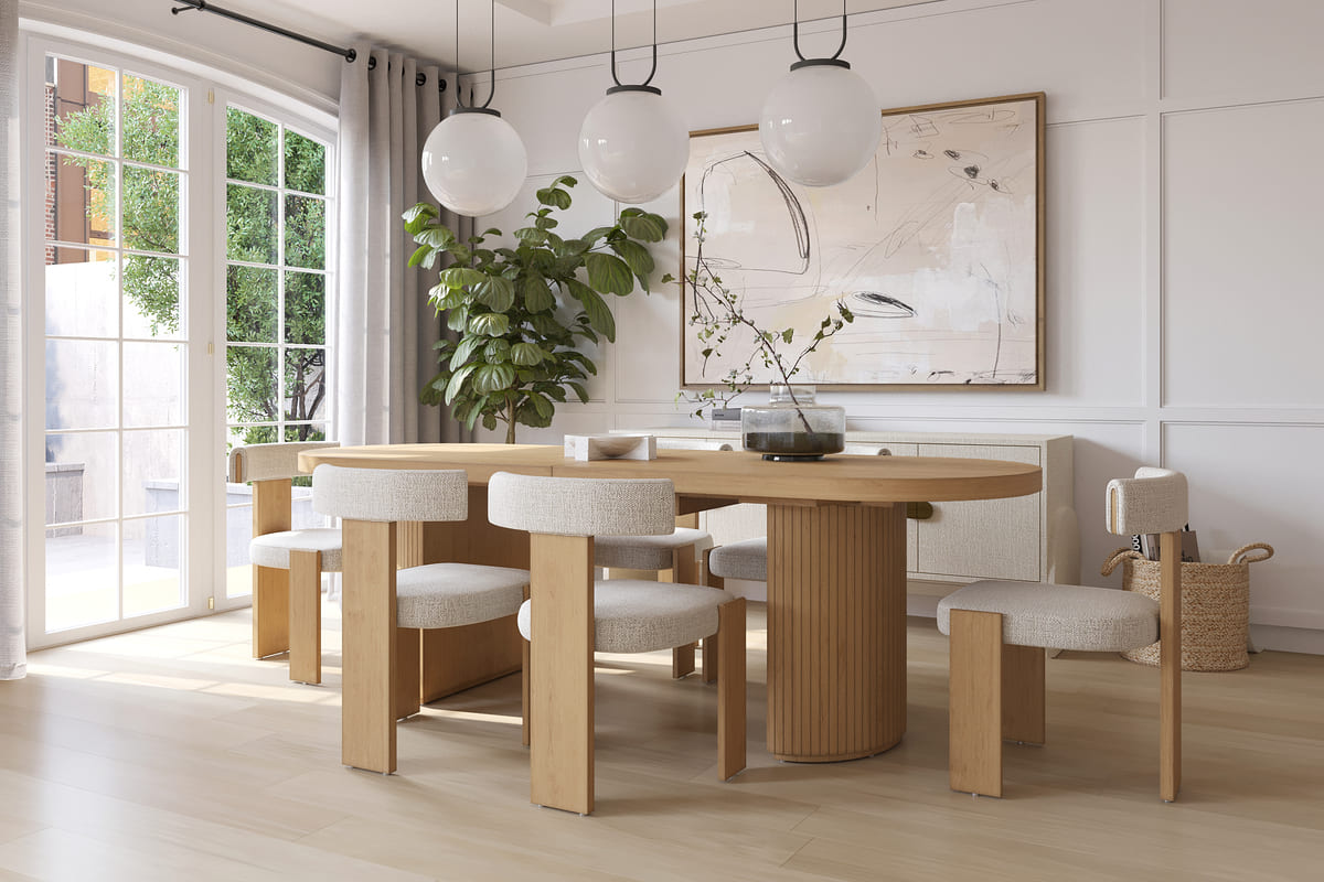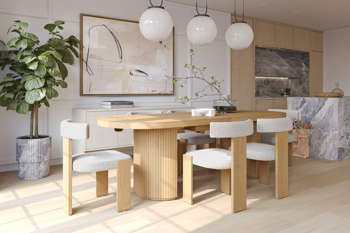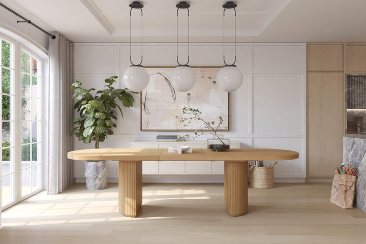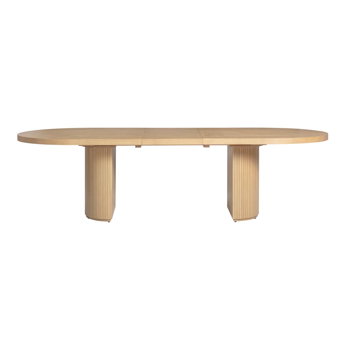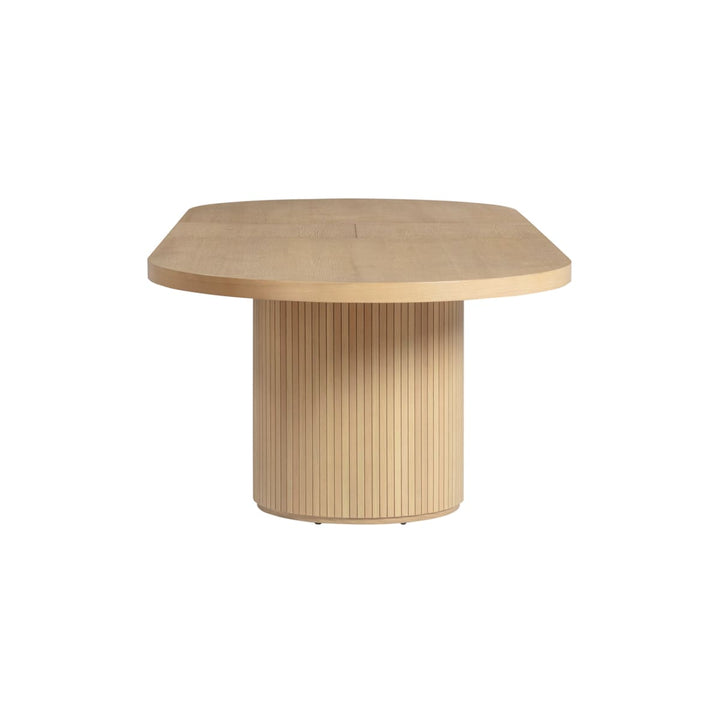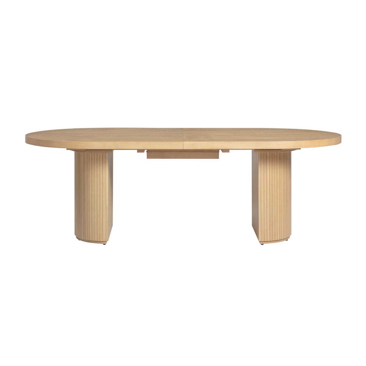 The Marlow Dining Table is a refined blend of modern design and natural warmth. Crafted in a smooth light oak finish, it features an elegant oval top supported by two sculptural fluted half-cylinder pedestal legs. Designed with both form and function in mind, the Marlow includes a discreet extension leaf, allowing you to comfortably expand the table for larger gatherings.