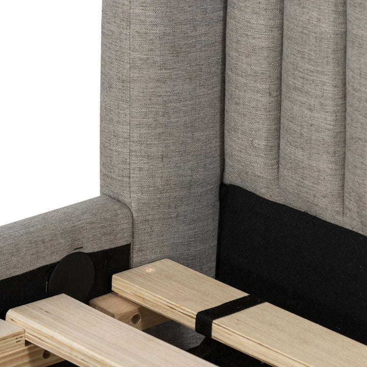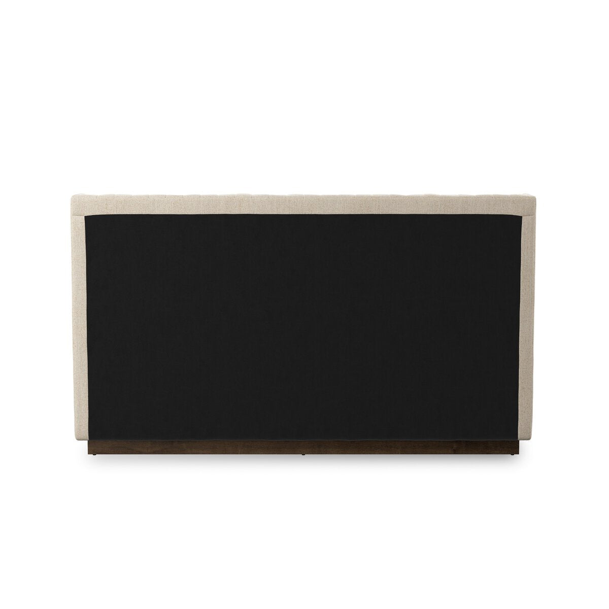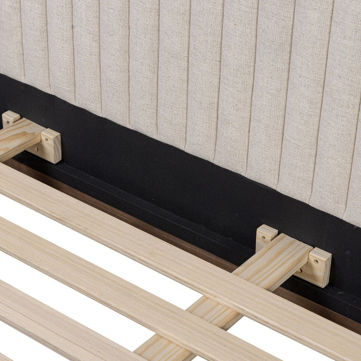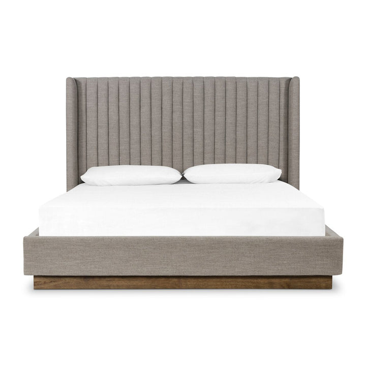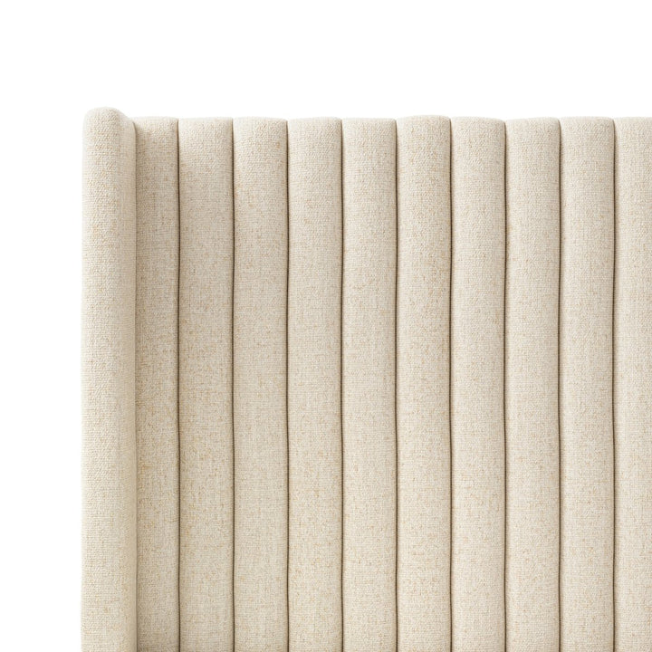 A tall, vertical-channeled headboard is upholstered in cream high-performance fabric for a sensible take on modern bedroom styling. A parawood plinth base grounds the whole look. Performance fabrics are specially created to withstand spills, stains, high traffic and wear, ensuring long-term comfort and unmatched durability.