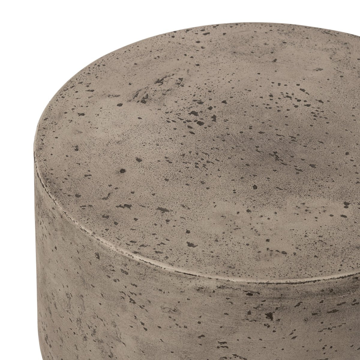 Solid concrete end table that can function as a garden stool. Perfect for layering in as a sturdy extra surface, indoors or out. Cover or store inside during inclement weather and when not in use.