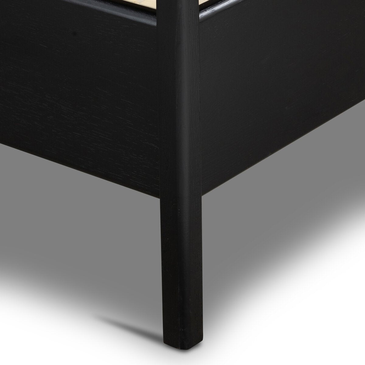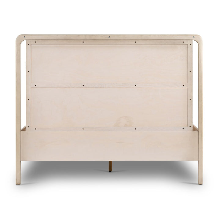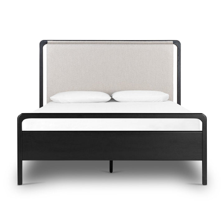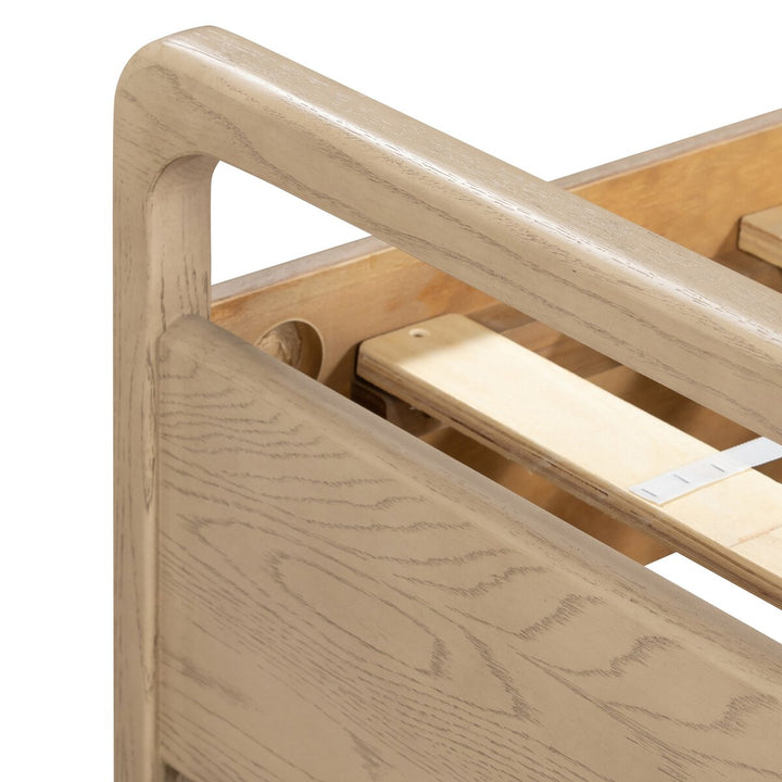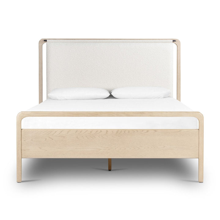 Oak frames a floating, sling-style headboard of boucle, with subtly rounded edges and metal dowel detailing. Rounded edges bring a touch of softness to the bedroom.