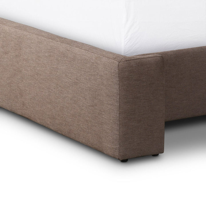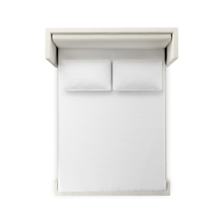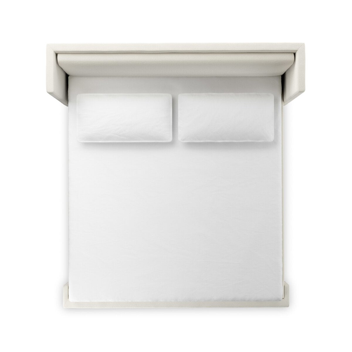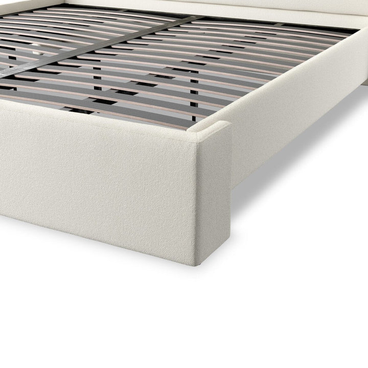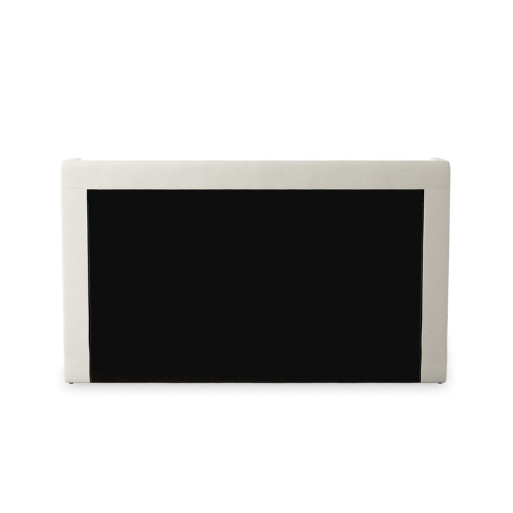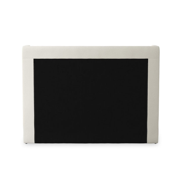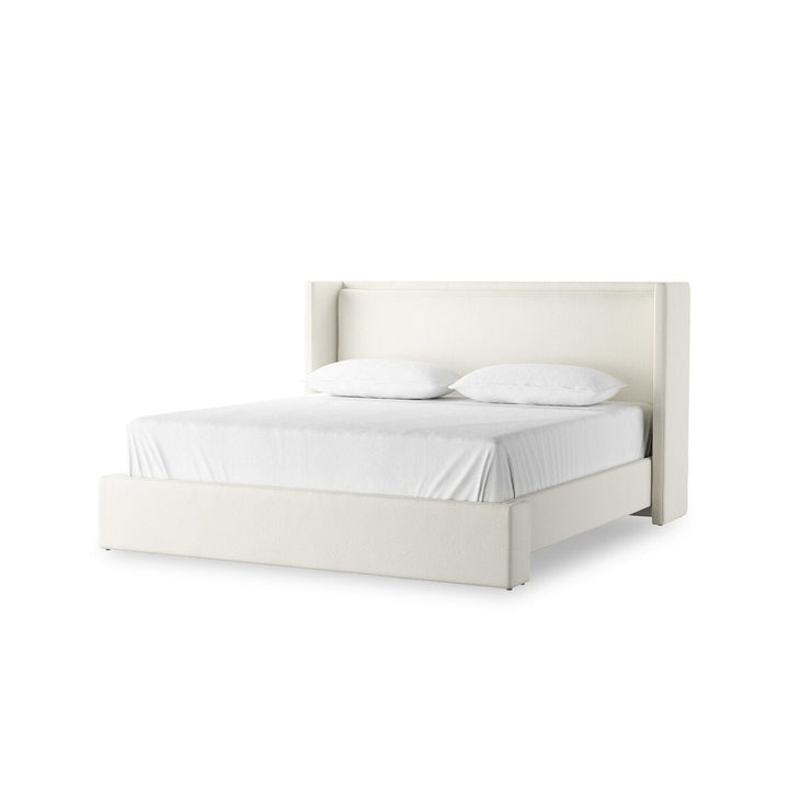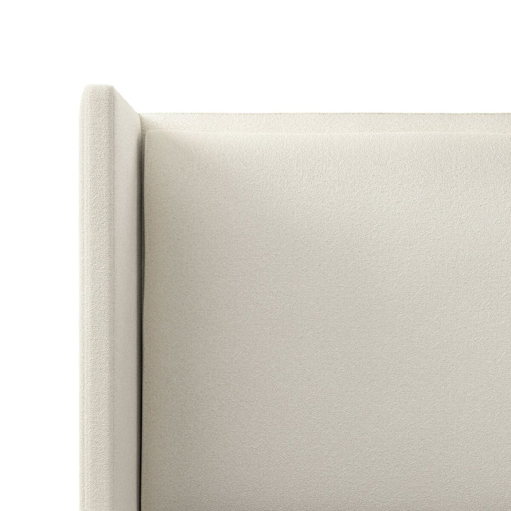 A shorter wingspan and geometric cutouts define this modern-day shelter wingback bed, designed for comfort from every angle. Upholstered in a cream fabric with subtle texture and a soft hand.